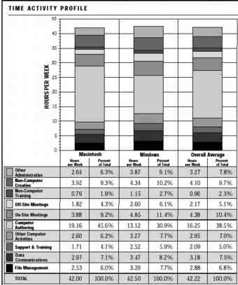 - Bénéficiant d'un environnement informatique plus favorable (intégration matérielle et logicielle, système optimisé pour le traitement multimédia et richesse des logiciels tiers), l'utilisateur Macintosh peut chaque année consacrer en moyenne 234 heures de plus que son homologue sous Windows aux activités de création pure.